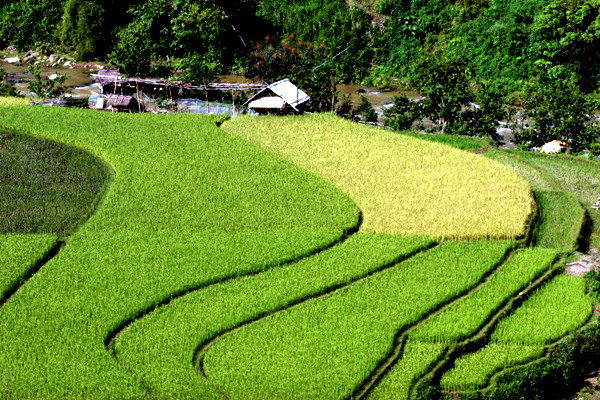 Những sóng lúa vàng trải dài dưới thung lũng, xếp tầng lớp men theo sườn đồi, đỉnh nối đỉnh. Sắc vàng của những cánh đồng chín xen lẫn sắc xanh của những cánh đồng nối vụ tạo thành dải lụa mềm mại, trong nắng mùa thu miền rẻo cao.