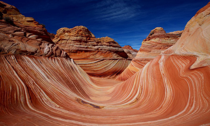 Sau hơn 190 triệu năm hình thành, những đụn cát biến thành núi đá gặp sự bào mòn bền bỉ của gió đã hình thành vô số đường cong mềm mại như những con sóng, tại khu vực nằm giữa hai bang của Mỹ là Arizona và Utah.