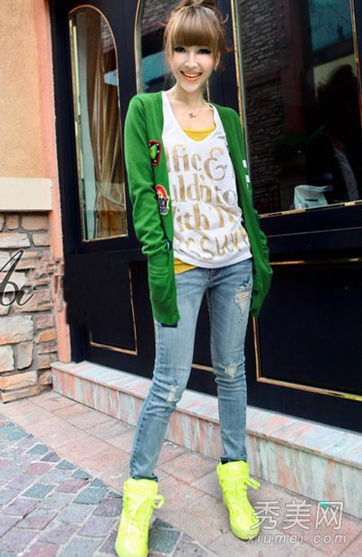 Nếu với bạn quần legging màu vàng là quá sặc sỡ vậy hãy chọn giầy màu vàng kết hợp cùng với áo cardigan màu xanh và quần jeans. Kết hợp với gọng kính mà xanh lá cây hoặc màu vàng tranh là phù hợp nhất.