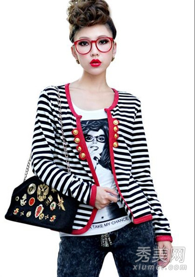 Gọng kính màu đỏ tươi luôn rất nổi bật, vì vậy nếu bạn biết cách kết hợp với trang phục thì sẽ tạo ra một phong cách thật tuyệt vời. Yếu tố quyết định chính là bạn phải biết cách chọn trang phục có cùng tone màu đỏ như gọng kính. Bạn có thể chọn giống như trong hình, áo cardigan viền đỏ tươi giống gọng kính và tất nhiên không thể thiếu son môi đỏ.