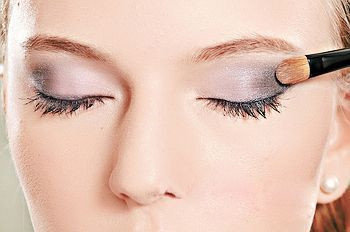 Bước 1: Dùng cọ mắt vừa bao phủ toàn bổ bầu mắt với gam màu hồng ngọc trai nhẹ để làm nền, sau đó nhấn mạnh 1/3 bầu mắt với gam màu tím oải hương. Tiếp đó, bạn hãy dùng gam xám ánh bạc nhấn mạnh tại đuôi mắt.