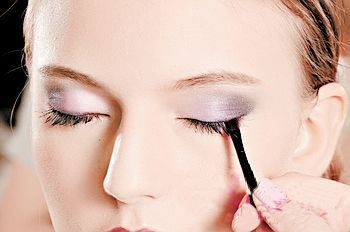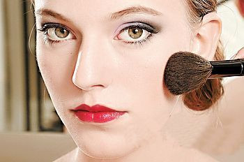 Bước 3: Chuốt mascara cho cả mi trên và mi dưới. Sử dụng gam màu hồng nhạt để đánh má, bắt đầu đặt cọ từ điểm cao nhất của gò má, đánh tản đều theo đường tròn ra sát tai.