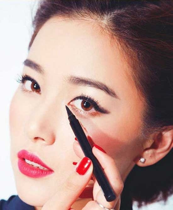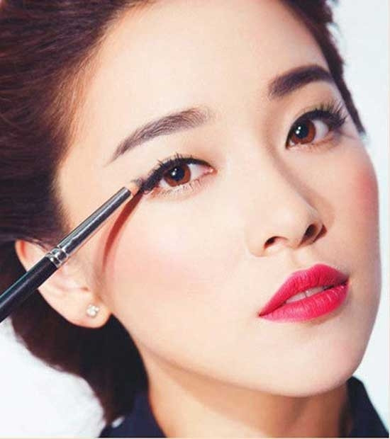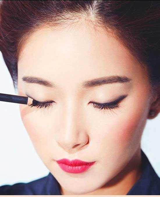 Sau khi trang điểm và chuốt mascara bạn tiến hành kẻ với chì. Dùng chì kẻ mắt đầu tròn để tô đậm đường viền mắt.