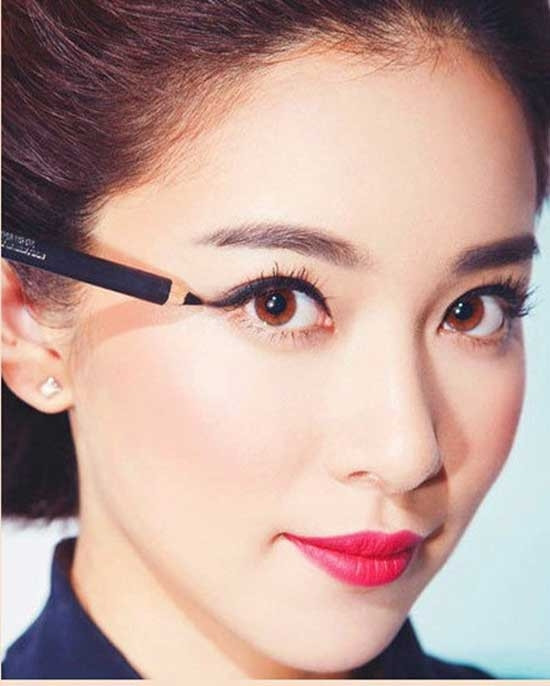 Dùng chì kẻ nhọn để kẻ phần đuôi mắt sắc nét. Kéo dài qua đuôi mắt và hơi cong một chút nhé!