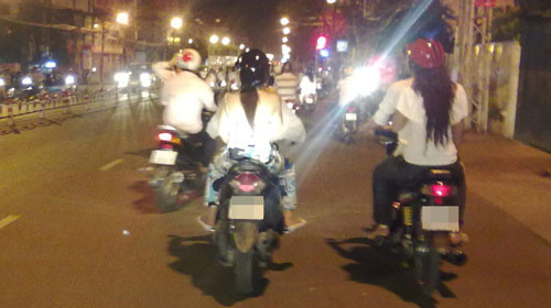 Đúng 1h sáng, Bờm đón tôi ở đường Hậu Giang, Q.6 để chứng kiến những bóng hồng tham gia một đợt đi “bão”. Tất cả đều còn rất trẻ, chỉ từ 14-17 tuổi. Mỗi người mặc mỗi kiểu, rất thời thượng. Người thì tóc bới cao, trang điểm kiểu mắt lợt, môi thâm giống Hàn Quốc, mặc chiếc váy ngắn cũn cỡn. Thậm chí một vài cô bé chỉ quấn mỗi miếng vải ngang ngực...