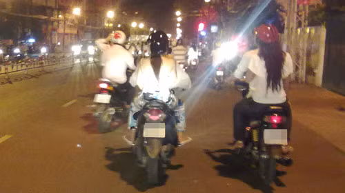 Cả nhóm, cứ một nam cầm lái rồ ga, một nữ sau lưng phóng như bay ra đại lộ Đông - Tây rồi thẳng tiến về hướng trung tâm TP. Vận tốc các xe phải đến hơn 100km/giờ, vừa chạy vừa vê ga, bó vỉa, lạng lách, quẹt chân chống xuống mặt đường tóe lửa.