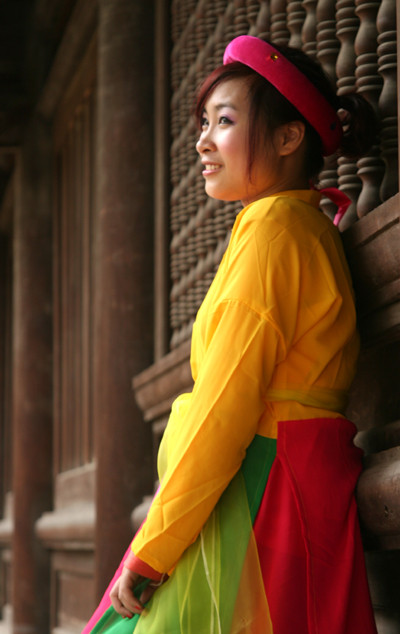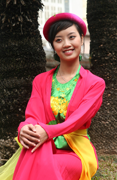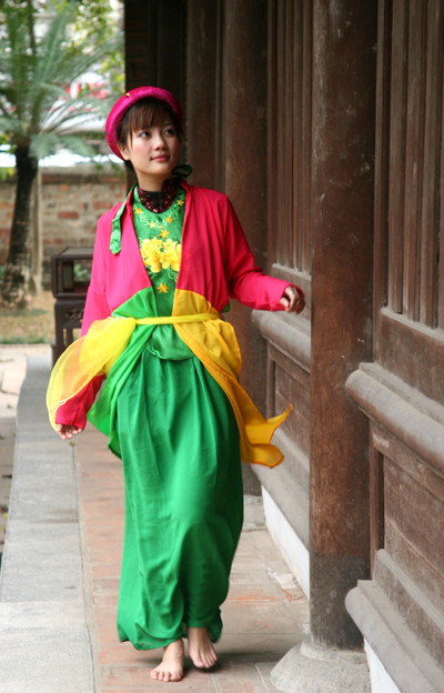 | Hài hòa áo the khăn xếp với yếm thắm, áo mớ ba mớ bảy. |