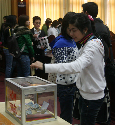 Đi cùng với tinh thần là sự ủng hộ về vật chất để nhân dân Nhật Bản khắcphục hậu quả. (Trong ảnh là sinh viên trường ĐHKHXH&NV ủng hộ tạichương trình "Chia sẻ với những người bạn Nhật Bản").