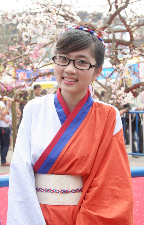 | Các bạn trẻ trong trang phục kimono tạo dáng bên những chùm hoa anh đào, được chuyển về từ Nhật Bản. |
