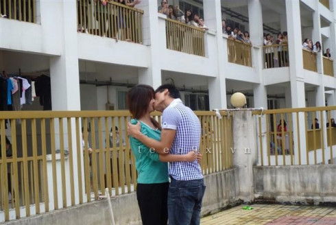 | Sau phút giây kiss đắm đuối, có vẻ cô gái đã thấy xí hổ trước hàng ngàn đôi mắt. |