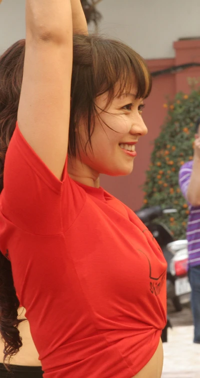 Trong đồng phục Shimmy Mob Kit (áo đỏ, quần và đai khăn) các nữ vũ công đem đến những động tác uyển chuyển hấp dẫn và những đường nét gợi cảm; gương mặt tươi tắn.