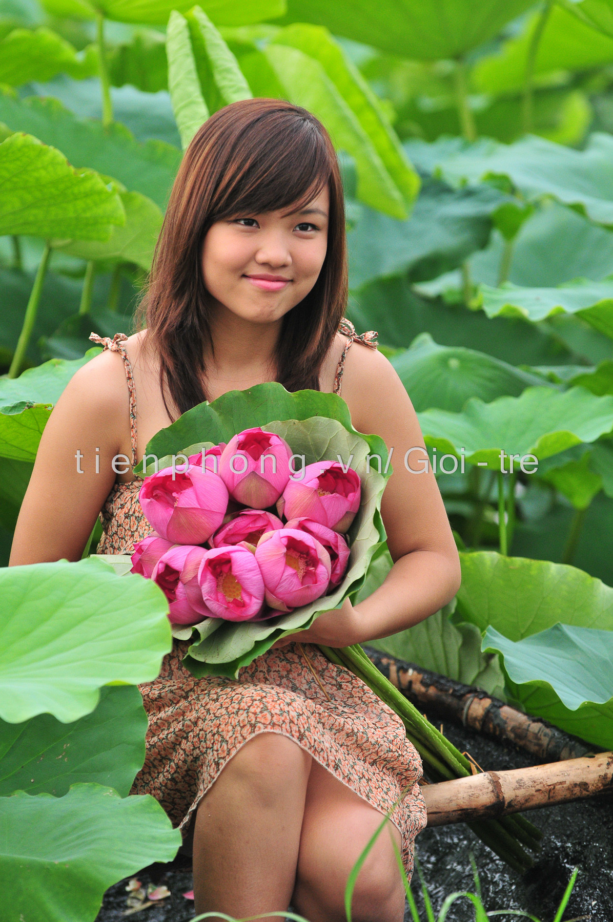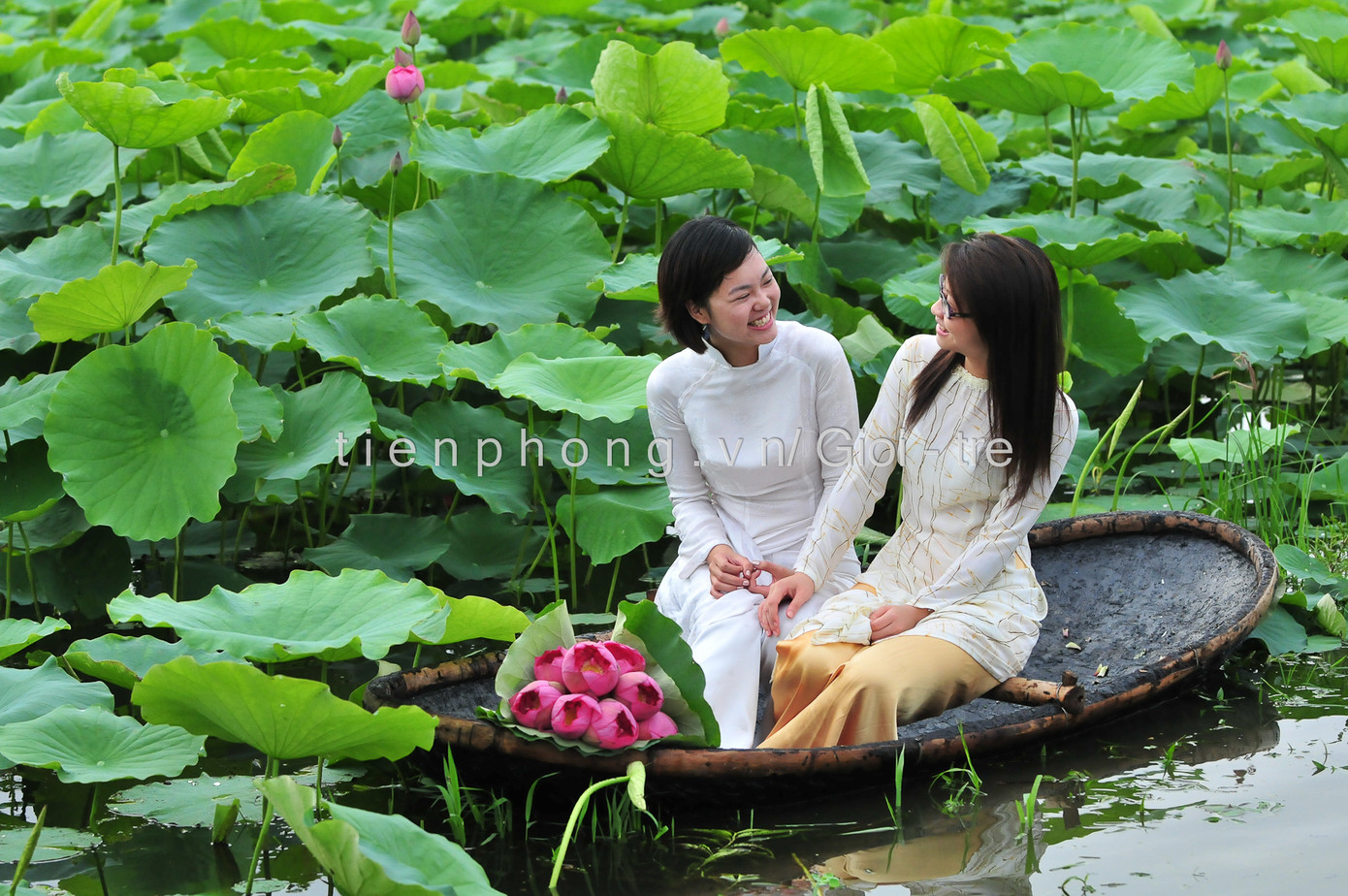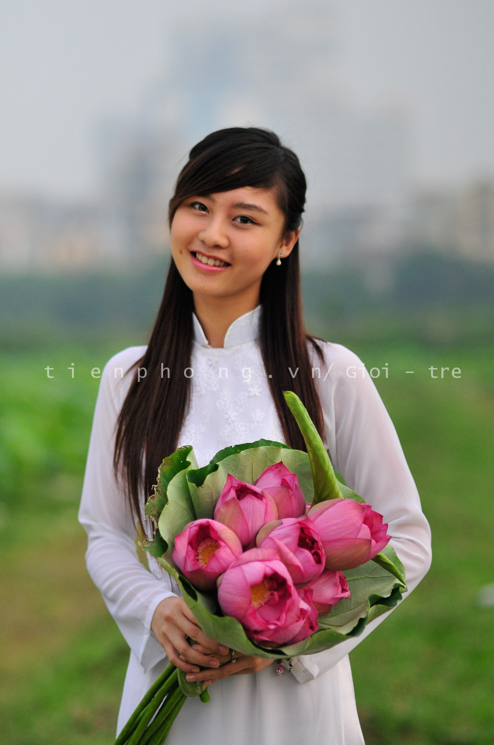 Áo dài trắng thường được các thiếu nữ lựa chọn để chụp cùng hoa sen.