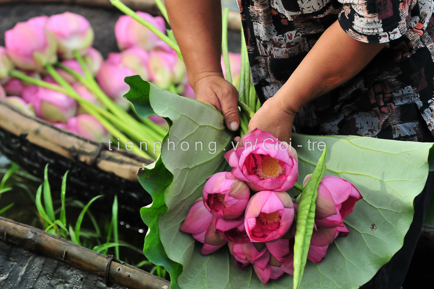 Mỗi một bó hoa sen 10 bông được bán với giá 50.000 đ.