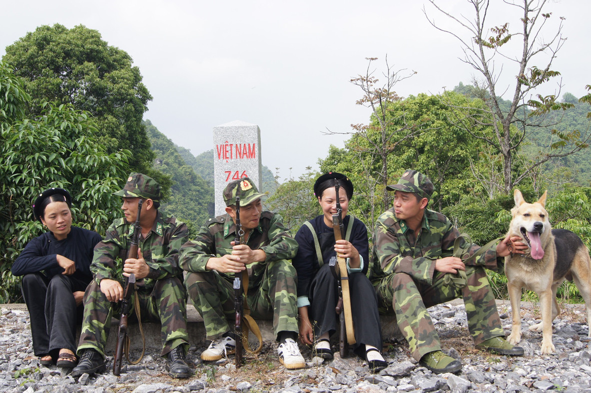 Thiếu úy Trần Nguyên Hưng thuộc Đồn biên phòng Pha Long – BĐBP Lào Cai (người đi đầu) đang cùng đồng đội và nữ dân quân địa phương tuần tra bảo vệ biên giới.