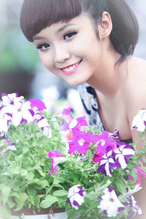 > Người mẫu 13 tuổi thả dáng bên hoa xuân