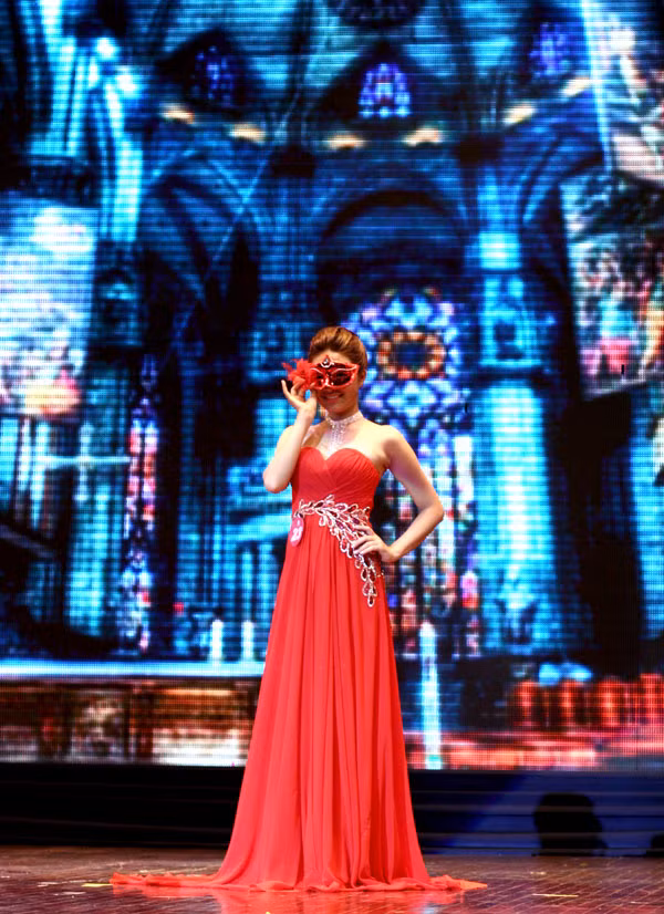 Dấu mình sau những chiếc mặt nạ kiểu cách, các thí sinh lần lượt được những chàng trai lịch lãm cầm tay dẫn ra chào khán giả. Lúc này các thí sinh sải những bước dài tự tin trình diễn.