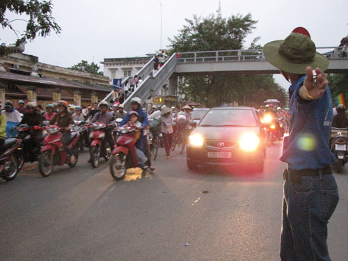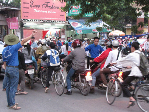 | Ngày nào, các sinh viên tình nguyện này cũng không quản nguy hiểm, đứng giữa một rừng phương tiện để điều tiết giao thông trong giờ cao điểm buổi chiều. Ảnh: Lãng Phong. |