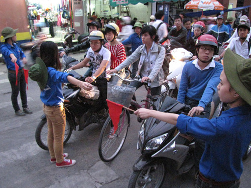 | Đội điều tiết giao thông có nhiều bạn nữ. Ảnh: Lãng Phong. |