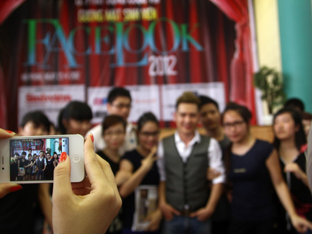 | Các bạn nữ sinh còn chụp hình với nam ca sĩ này. |