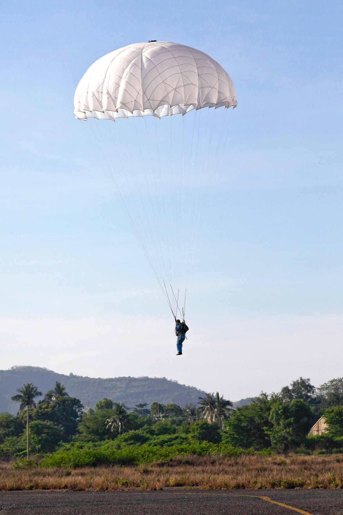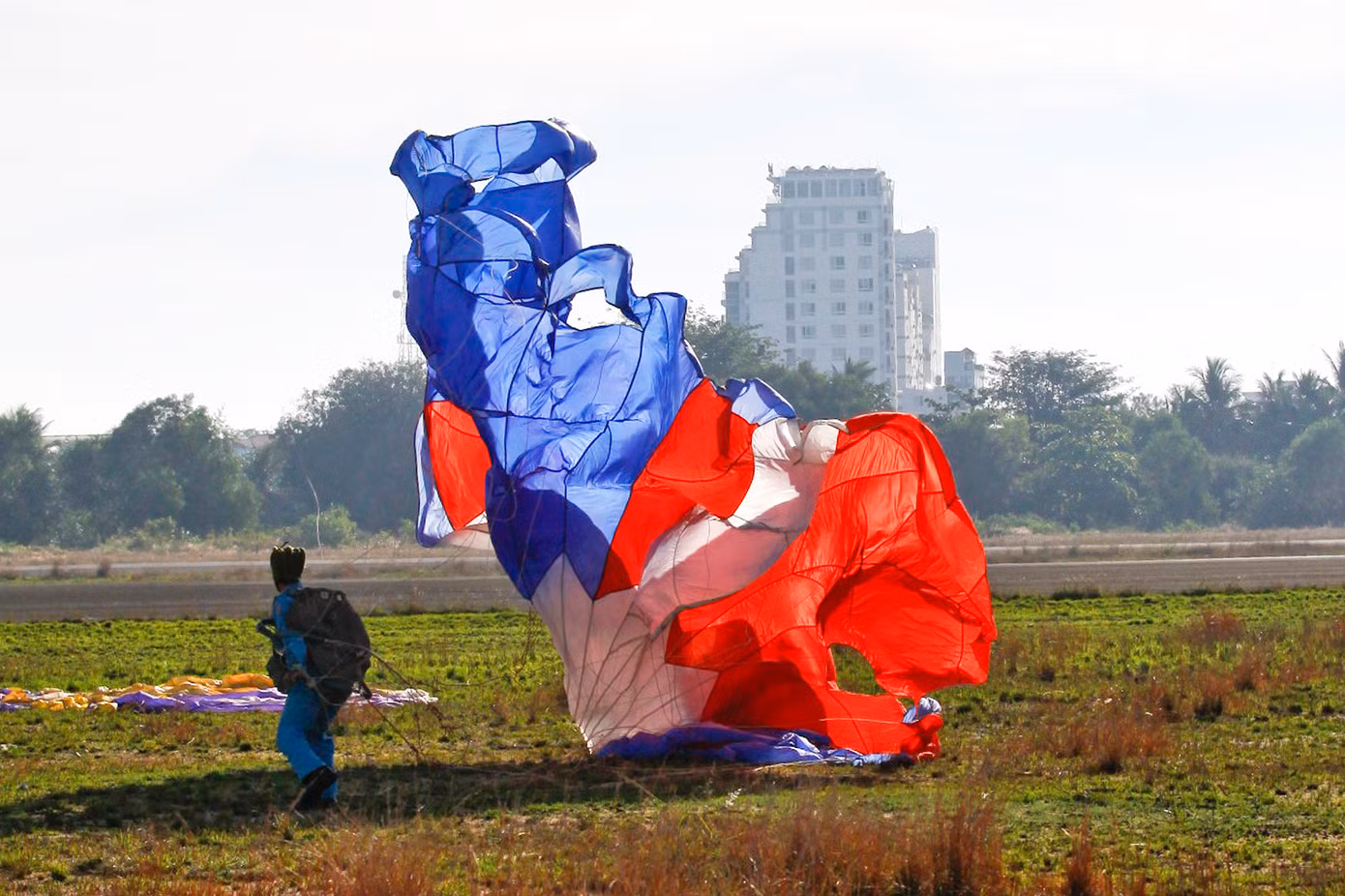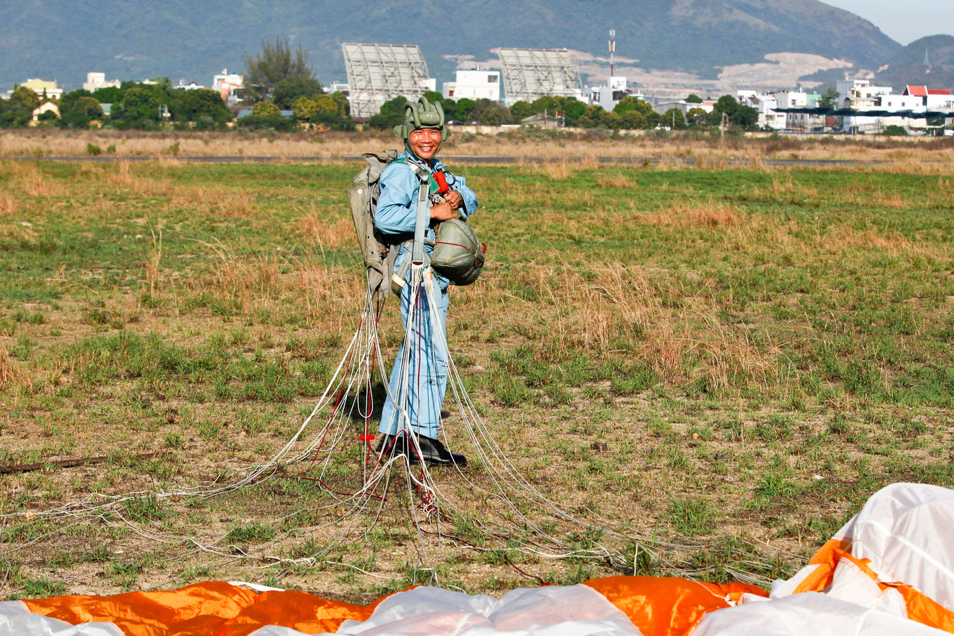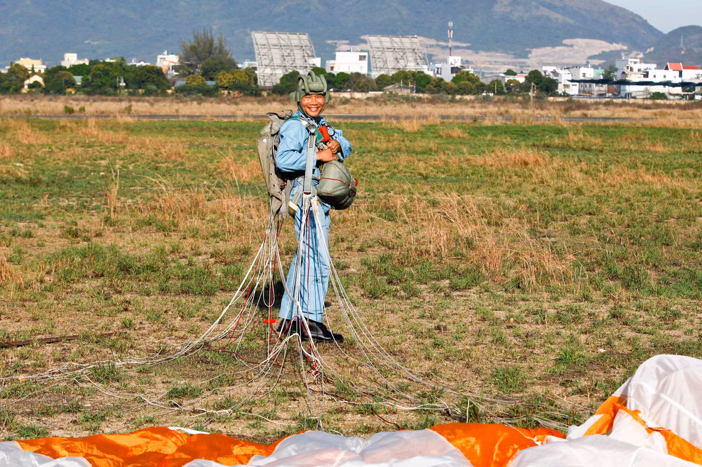 Tiếp đất an toàn, đúng vị trí với dù phụ còn nguyên ở trước ngực.