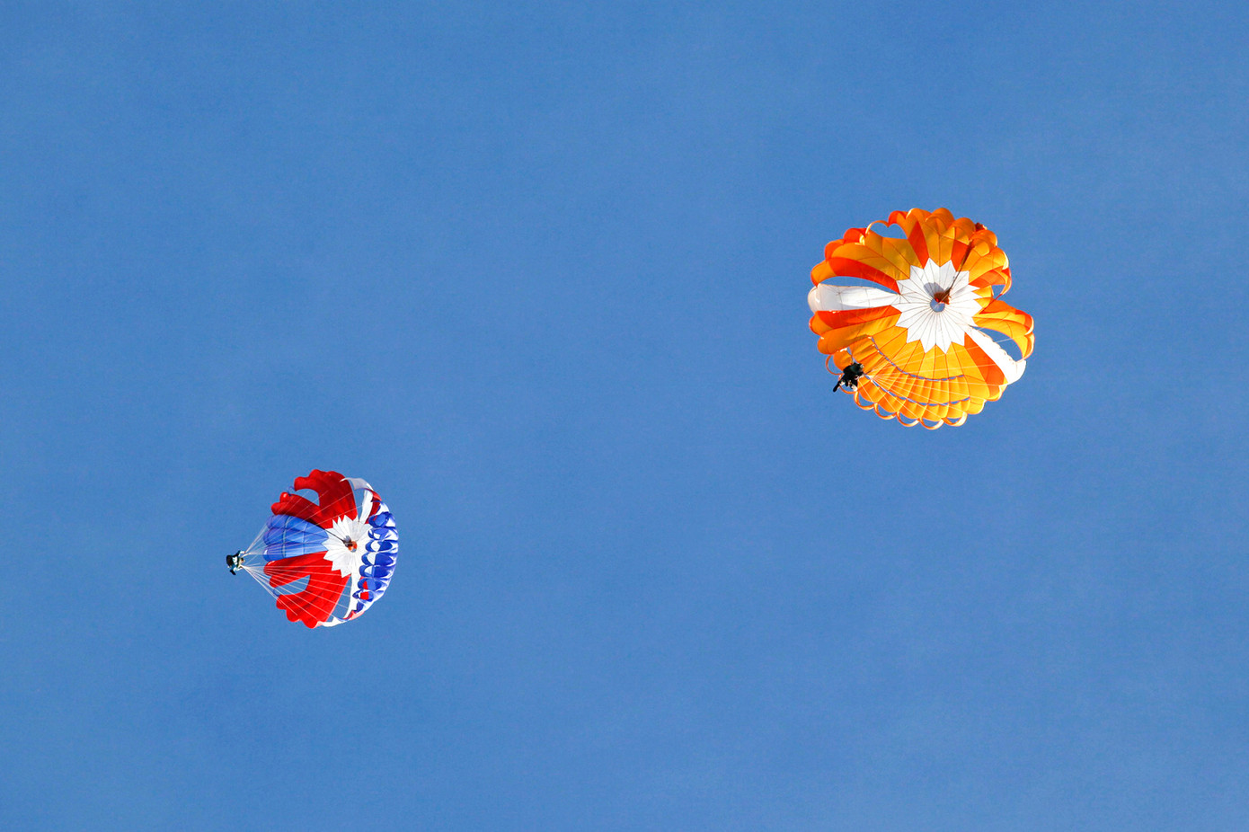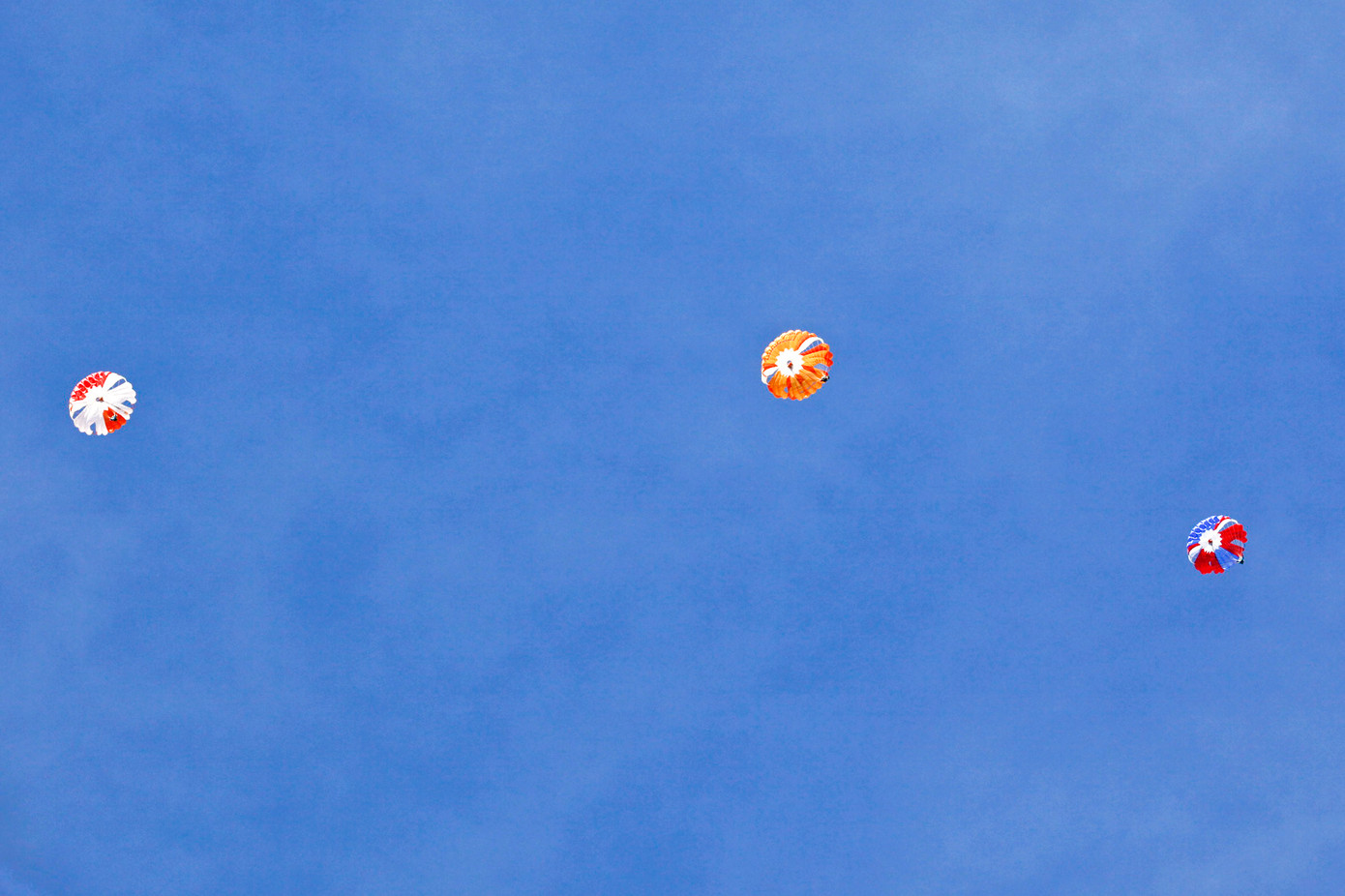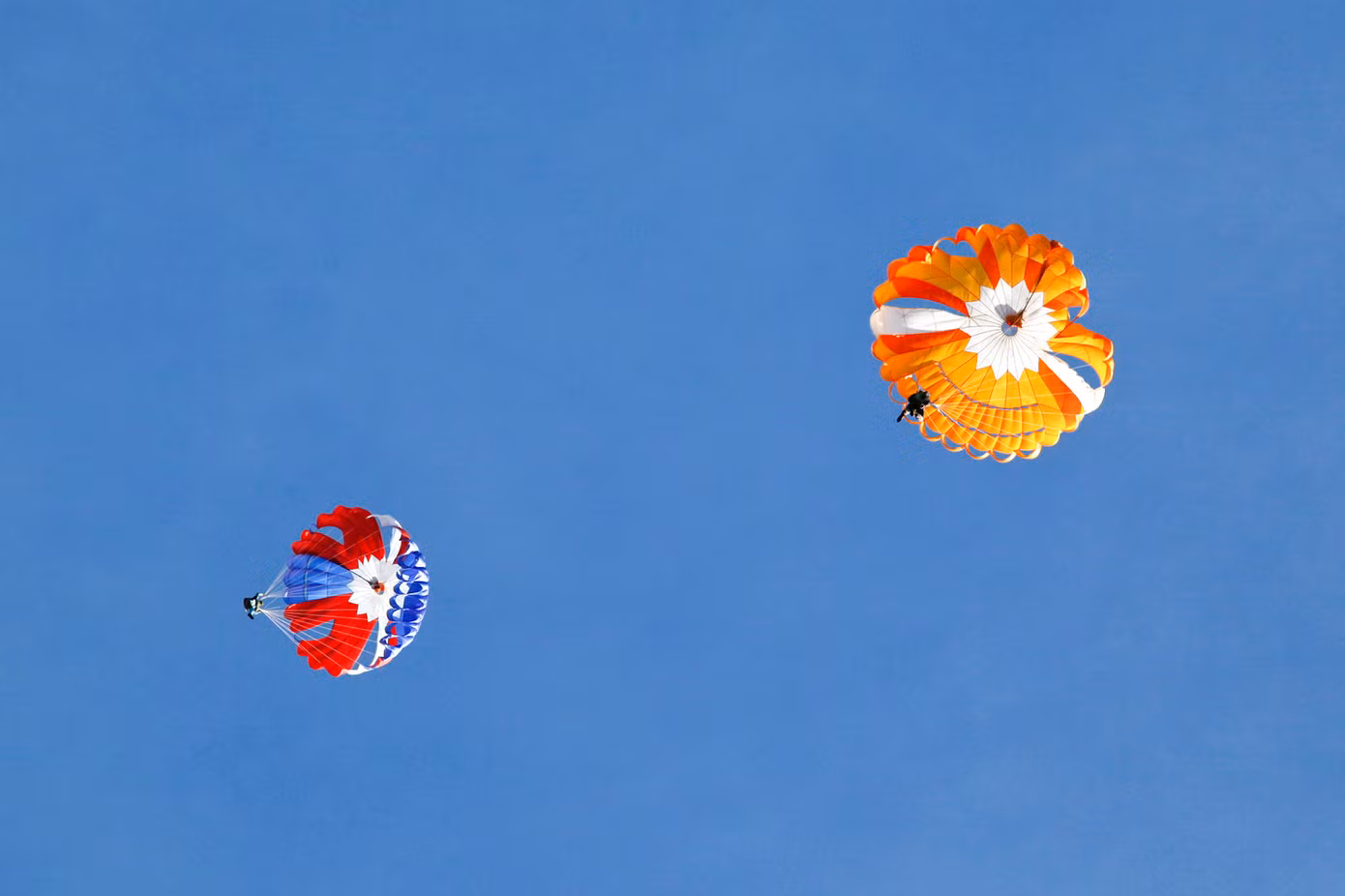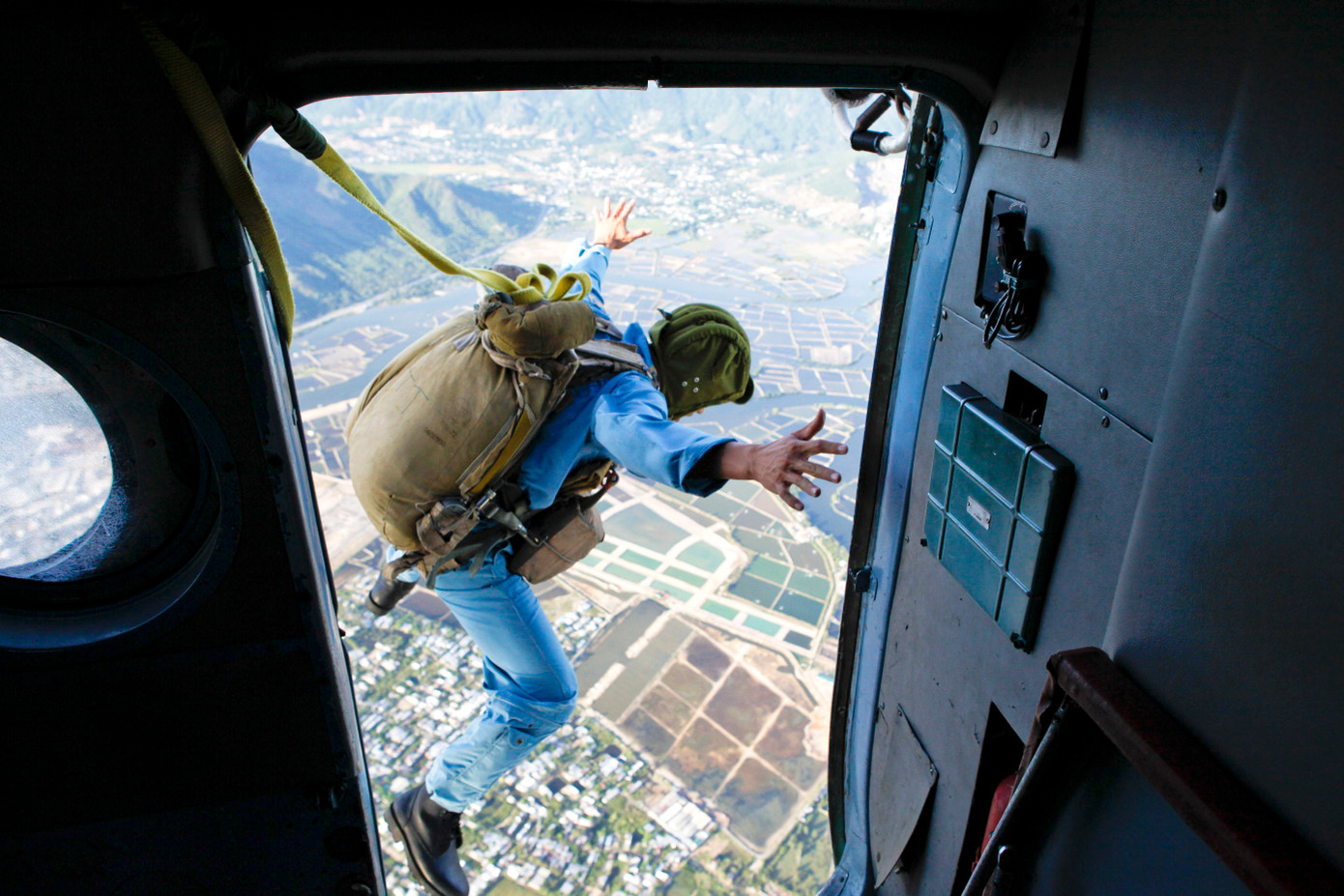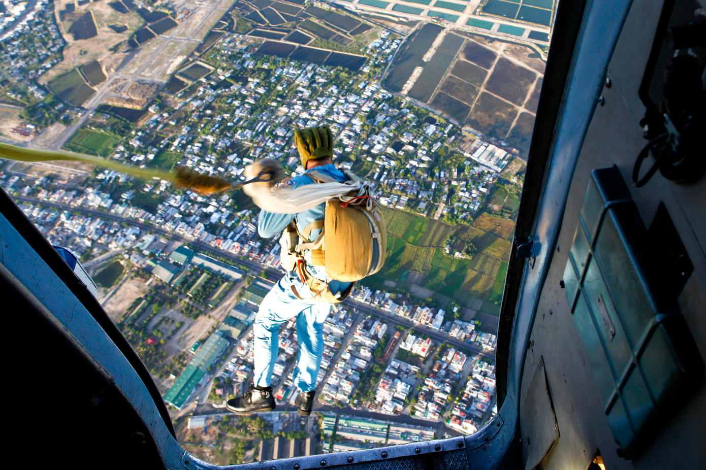 Tiếp đất an toàn, đúng vị trí với dù phụ còn nguyên ở trước ngực.
