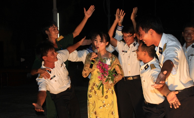Ngay từ đầu buổi tối, hàng trăm cán bộ chiến sĩ, người dân đảo Sinh Tồn, cùng đoàn công tác có mặt tại trung tâm đảo háo hức chờ đội văn công biểu diễn.