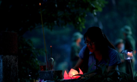 Đúng 19 giờ, hàng nghìn ngọn nến đã được các bạn trẻ thắp lên trên các phần mộ liệt sĩ. Trong không gian lung linh, linh thiêng của ánh nến ở nghĩa trang Hàng Dương, các bạn trẻ đã nghiêng mình trước anh linh của các anh hùng liệt sĩ đã ngã xuống trên mảnh đất này.