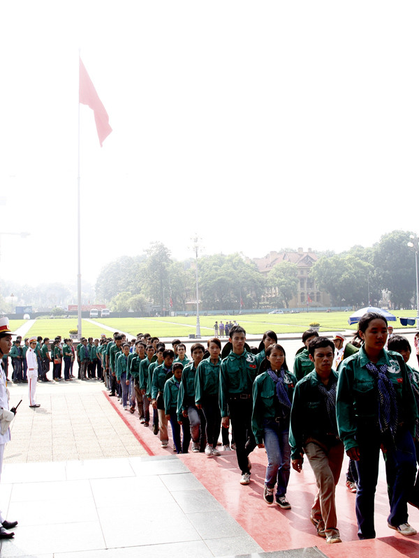 Đúng 9 giờ, màu áo xanh nghiêm ngắn đội ngũ trước lăng Chủ tịch Hồ Chí Minh dự lễ báo công. Tại đây, đoàn đã có đánh giá tổng kết hoạt động, hiệu quả công việc cũng như những hạn chế và biên pháp khắc phục của chương trình xuyên Việt năm nay