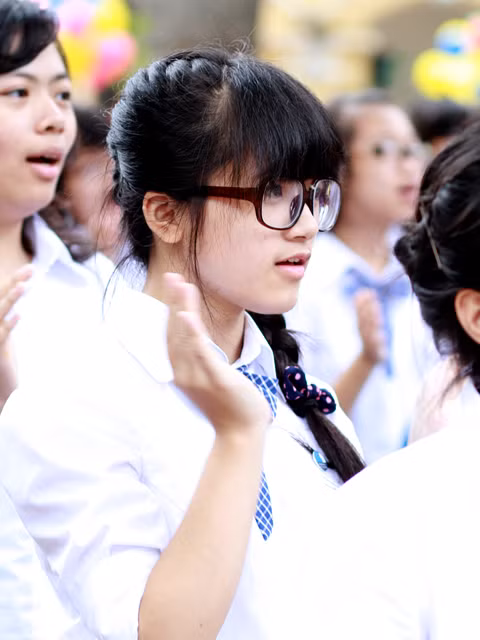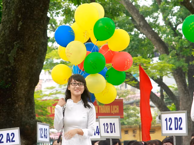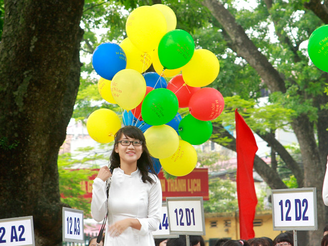 | Sân trường ngày khai giảng rợp màu sắc của bóng bay và màu trắng đồng phục. |