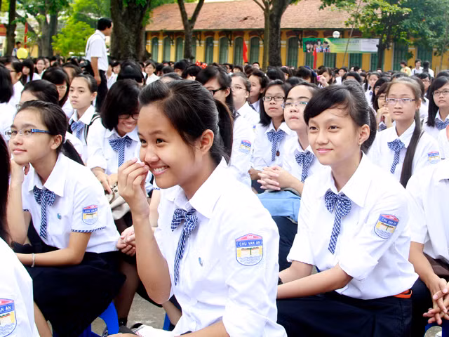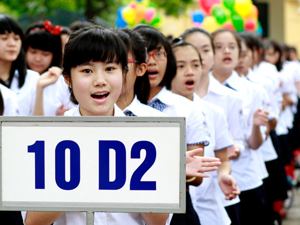 | Những nữ sinh khối 10 tươi tắn trong đồng phục áo sơ mi trắng và váy xanh. |