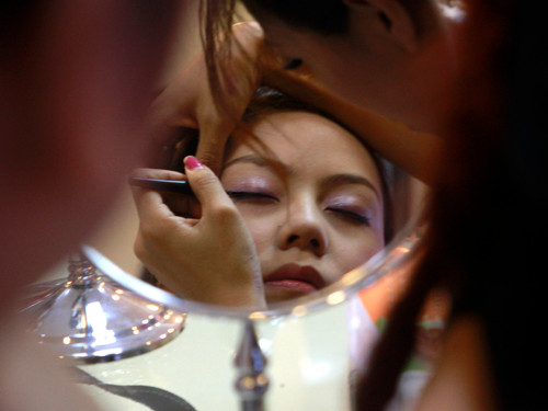 | Các bạn thí sinh được các chuyên gia hướng dẫn trang điểm cụ thể từng nét trên khuôn mặt.. |