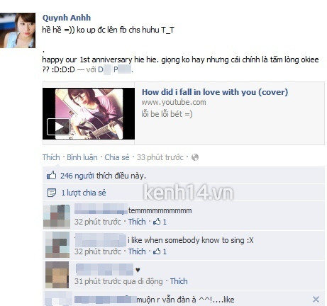 Những nghi ngờ về anh chàng bí ẩn của Quỳnh Anh Shyn được cư dân mạng bàn tán xôn xao. Trước đó, trên facebook cá nhân của Quỳnh Anh đã xuất hiện đoạn clip hát tặng người yêu. Cô nàng đã cover bài hát "How did I fall in love with you" cực ngọt và tag tên một anh chàng vào. Quỳnh Anh cũng bày tỏ: “Happy our 1st anniversary hie hie. Giọng không hay nhưng cái chính là tấm lòng okiee”.