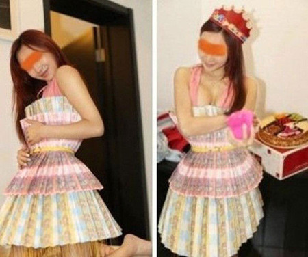 Thích nhất là chiếc váy toàn bằng tiền mặt mà cha nuôi đã mất bao công sức để mua được, nghe nói giá trị của nó lên đến 20 vạn nhân dân tệ cơ đấy, các bạn đừng có đỏ mắt vì ghen tị nhé. Đặt chiếc váy này vào tủ đồ hiệu LV, Chanel thật là một trời một vực".