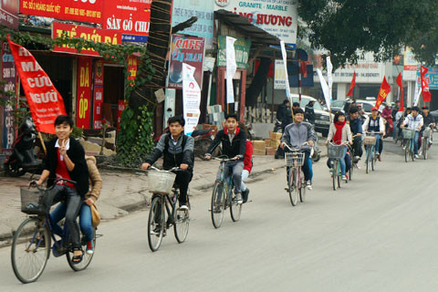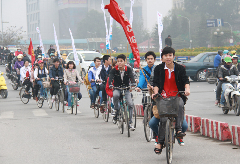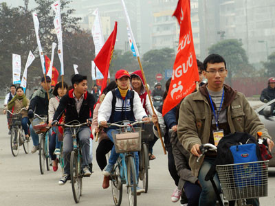 Có mặt tại cổng trường ĐH Quốc gia Hà Nội, 50 bạn sinh viên của các trường trong địa bàn như Học viện Báo chí Tuyên truyền, ĐH Công nghệ, Ngoại ngữ (ĐH Quốc gia), ĐH Điện lực,…đã có mặt đông đủ chuẩn bị cho cuộc diễu hành theo cung đường: ĐH Quốc gia Hà Nội- Phạm Văn Đồng- Hoàng Quốc Việt- Đường Bưởi- ĐH Giao thông Vận tải- Viện Huyết học và Truyền máu trung ương- ĐH Quốc gia Hà Nội.