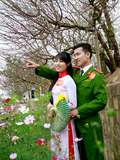 | Những nam thanh nữ tú học viện Cảnh sát trong với bộ cảnh phục nghiêm ngắn, áo váy duyên dáng đã tạo dáng giữa không gian đầy hương sắc của mùa xuân |