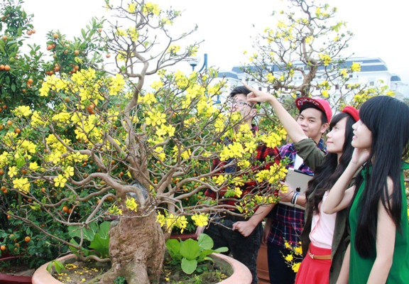 | Nhóm bạn trẻ thích thú với loài hoa rực rỡ hoa sắc đua nhau khoe nở đón Tết. |
