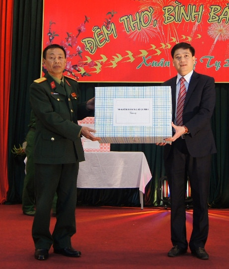 | Thiếu tá Thái Đức Hạnh (bên phải), Ủy viên Ban Thường vụ T.Ư Đoàn, Trưởng ban Thanh niên Quân đội tặng quà, chúc Tết Lữ đoàn 144. |