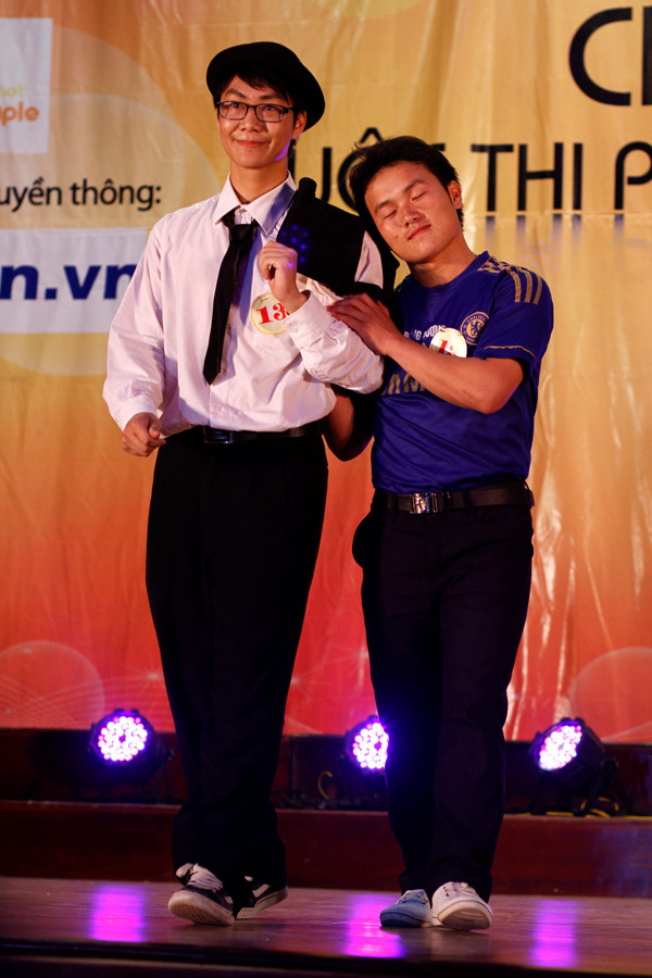 | Hot couple Thảo Tiên - Phương Anh. Cặp đôi này đã mang đến phần dự thi tài năng ấn tượng khi hát trên nền nhạc được tạo bằng tay, cốc nhựa và bàn gỗ. |