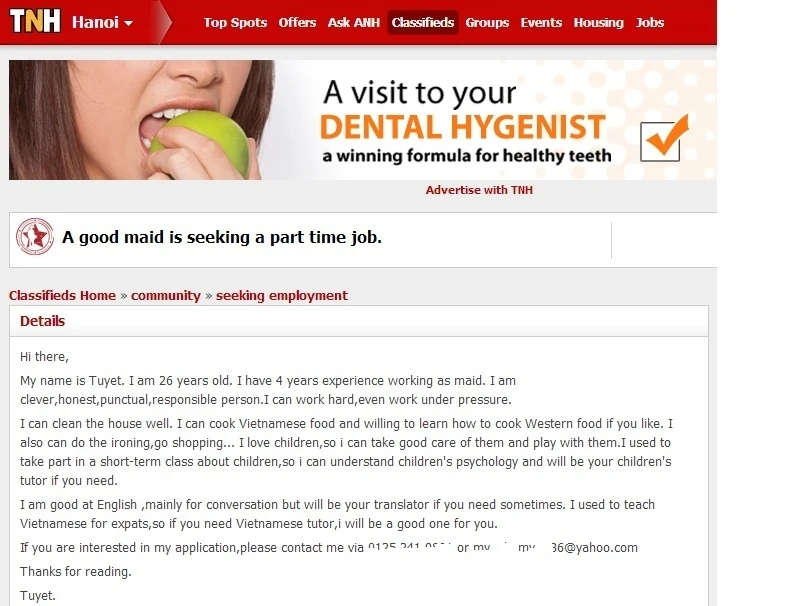 Một nghề dường như không hề liên quan đến văn phòng, ứng viên cũng lên mạng đăng thông tin cá nhân, giới thiệu kinh nghiệm làm việc và đặc biệt là khả năng ngoại ngữ... đó là nghề giúp việc cho Tây.
