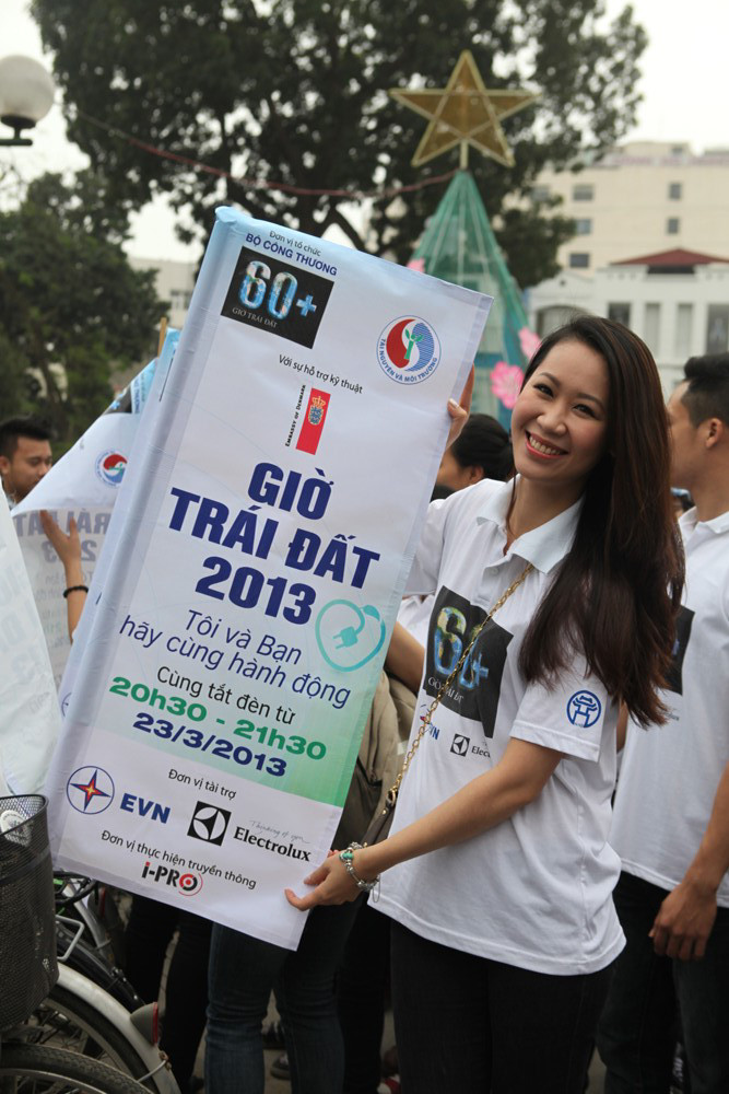 Cùng tham gia buổi đạp xe còn có bà Lis Rosenholm - Phó Đại sứ Đan Mạch tại Việt Nam và các Đại sứ Giờ Trái Đất 2013 là ca sĩ Tùng Dương, Hoa hậu Thân thiện Dương Thùy Linh.