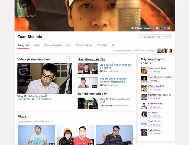 Toan Shinoda là tên kênh chính thức Toàn dùng để chia sẻ các video, clip trên Youtube, hiện tại, kênh của Toàn thu hút hơn 600 nghìn lượt đăng ký theo dõi. Hầu hết các vlog của Toàn đều được quay dựng công phu, nội dung có đầu tư, nổi tiếng với phong cách châm biếm với khá nhiều ngôn từ tự chế ấn tượng.