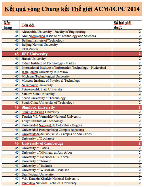 Kết thúc cuộc thi, Đội tuyển trường ĐH FPT xếp thứ 45 trong bảng tổng sắp – giải được 2/12 bài - đồng hạng với 34 trường đại học khác cũng chỉ giải được 2 bài, trong đó có những trường như ĐH Standford (Mỹ), ĐH Cambridge (Anh)…