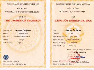 | Điều 1. Ban hành kèm theo Thông tư này mẫu bằng tốt nghiệp đại học. Bằng tốt nghiệp đại học gồm bốn (4) trang, mỗi trang có kích thước 21cm x 14,5cm. Trang 1 và trang 4 có nền màu đỏ; trang 1 có hình Quốc huy, các chữ in trên trang 1 có màu vàng; trang 2 và trang 3 có nền màu vàng, hoa văn viền màu vàng đậm, tên bằng tốt nghiệp đại học bằng tiếng Việt và tiếng Anh có màu đỏ, các chữ khác có màu đen; hình trống đồng in chìm chính giữa trang 2, hình Quốc huy in chìm chính giữa trang 3. Cách ghi nội dung trên bằng tốt nghiệp đại học quy định tại Phụ lục kèm theo Thông tư này. Điều 2. Thông tư này có hiệu lực thi hành kể từ ngày 01 tháng 10 năm 2009. Các quy định trước đây trái với Thông tư này đều bãi bỏ. (Trích thông tư 22 của Bộ GD- ĐT ) |