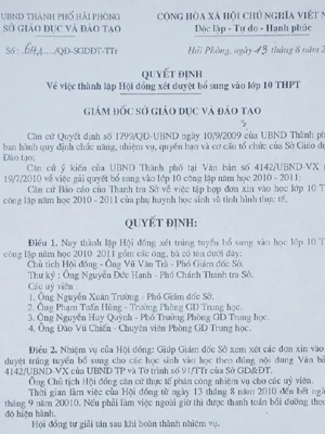 Trong khi đó, ông Đỗ Thế Hùng, Giám đốc Sở GD&ĐT còn ký quyết định thành lập Hội đồng xét tuyển bổ sung vào lớp 10 (giao ông Vũ Văn Trà, Phó Giám đốc Sở làm Chủ tịch Hội đồng). Dấu hiệu vi phạm nghiêm trọng hơn là Hội đồng xét duyệt đặc cách này còn được trả công, nhờ quy định: “Nếu làm việc ngoài giờ thì được thanh toán bồi dưỡng theo chế độ hiện hành”.