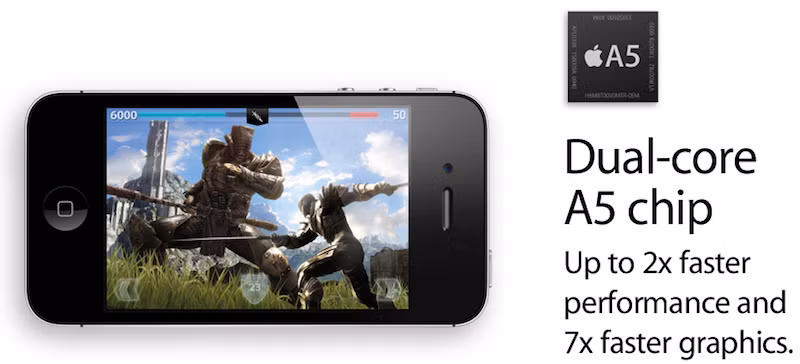 Sau những thất vọng ban đầu, cấu hình “khủng” mới của iPhone 4S sẽ phần nào lấy lại hưng phấn cho các fan của thương hiệu “Quả táo”. Trước tiên, iPhone 4S được trang bị bộ xử lý A5 mới nhất, từng xuất hiện trên máy tính bảng iPad 2. Cụ thể là bộ xử lý Cortex A9 lõi kép và bộ xử lý đồ họa PowerVR SGX543MP2, tăng tốc độ xử lý nhanh gấp bảy lần so với thế hệ cũ.