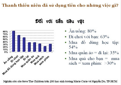 Cũng theo đại diện tổ chức trên, khi được cha mẹ cho nhiều tiền mà không kèm theo hướng dẫn, nhiều HS dễ xem nhẹ đồng tiền. Các em thường chi tiêu theo ham muốn, sở thích và sẵn sàng bỏ ra một số tiền lớn để mua sắm mà không đắn đo, lo nghĩ. Ở chiều hướng ngược lại, một số em tỏ ra khá thờ ơ với những vấn đề liên quan đến tiền bạc vì cho rằng chỉ cần tập trung vào việc học, còn lại mọi chuyện khác đã có cha mẹ lo.