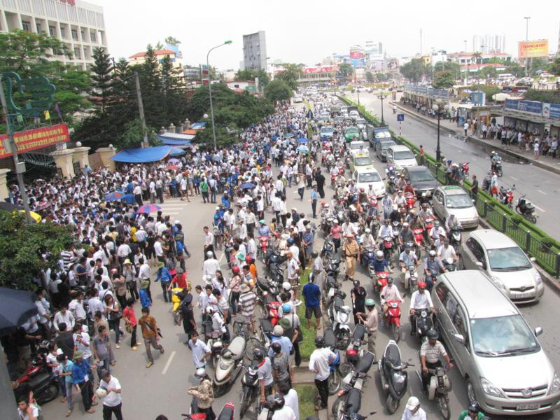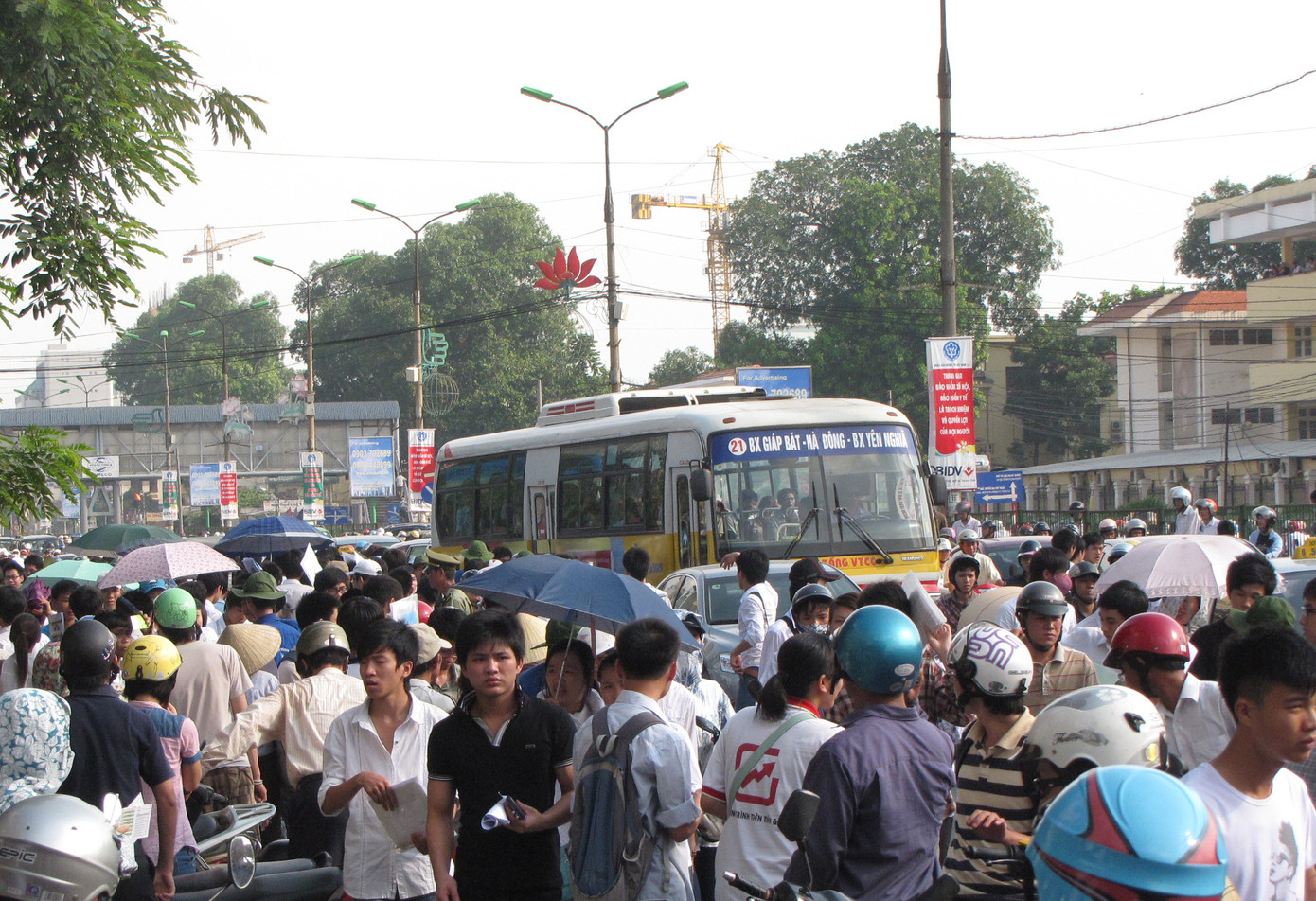 | Khu vực trước cổng trường ĐH Giao thông Vận tải ùn tắc nghiêm trọng do lượng thí sinh đổ ra đông, nhiều phương tiện qua lại khu vực này. |