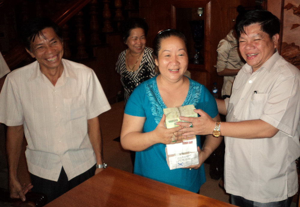 Ông Trần Văn Trí (phải) trả nợ tiền mua cá cho một hộ dân.