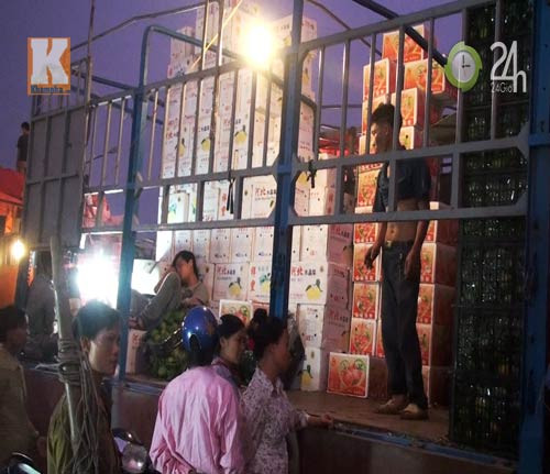 Dạo một vòng quanh chợ, chúng tôi cũng tìm ra được điểm tập kết và biết được nguồn gốc của loại cam giá rẻ đang được bán rộng khắp tại Hà Nội chính là cam Trung Quốc. Những chiếc xe tải trọng lớn từ vài tấn đến vài trăm tấn chen nhau đậu san sát phía cuối chợ. Dưới mỗi xe là hàng chục thương lái vay quanh để lấy hàng. Hàng trăm thùng cam xếp chồng lên nhau và cam được bọc kín bởi giấy báo Trung Quốc. Theo cánh lấy hàng, mỗi ngày có hàng trăm tấn cam được tập kết về đây rồi phân bổ đi khắp Hà Nội và nhiều tỉnh thành lân cận.