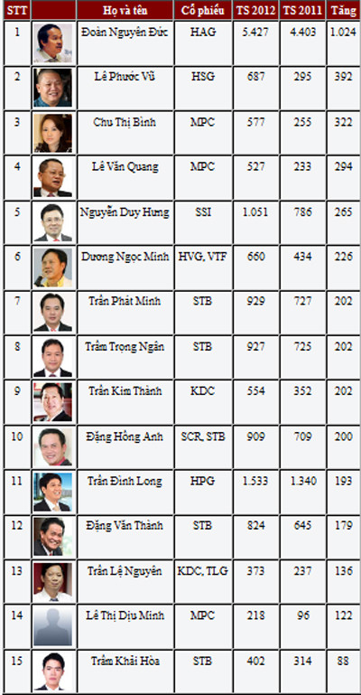 Theo thống kê của PV và đối tác cung cấp dữ liệu là Công ty chứng khoán VnDirect, tính đến ngày 1-11, 100 người được coi là có tài sản tăng mạnh nhất trên sàn chứng khoán năm 2012 đã tích lũy thêm hơn 7.200 tỷ đồng từ cổ phiếu.